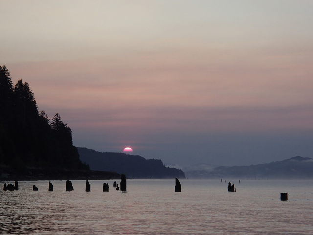 I arrived at about 6am to see plenty of kayak transport vehicles parked at a dirt pull-off along a highway at a spot that has come to be known as The Shipwreck.  Named after an old hydrofoil ship that was abandoned nearby along the shoreline, this spot on the Columbia River is a great place for kayakers to put in. I tried to set up as quickly as I could but with so many good friends around lots of chatting was inevitable. The wildfire smoke made for a beautiful sunrise both Saturday and Sunday!