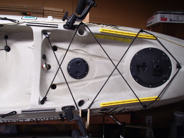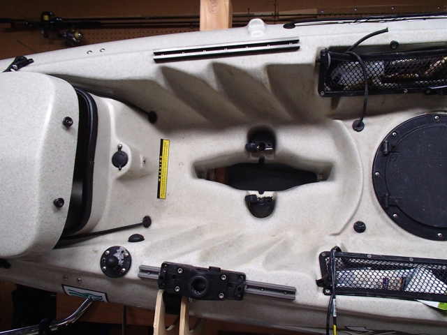 Before you order any gear tracks for your Revolution, reach inside your kayak and feel the area inside the gunwale under the location where you want to mount a gear track.  The area is narrow and pretty arched.  If you use bolts, nuts, and fender washers to mount something on the gunwale, you'll need to bend the washers to fit the curvature of the area under the gunwale, and if you get very far from the center of the area under the gunwale, your bolts will emerge into the side of the arched area, and your nuts will be hitting plastic on only one side.  If you try to use a backer bar to attach a gear track, unless you manage to get the backer bar centered exactly in the top of the arch, which is difficult to do, the backer bar is likely to end up hitting plastic with only its right front and left rear corner, or its left front and right rear corner.