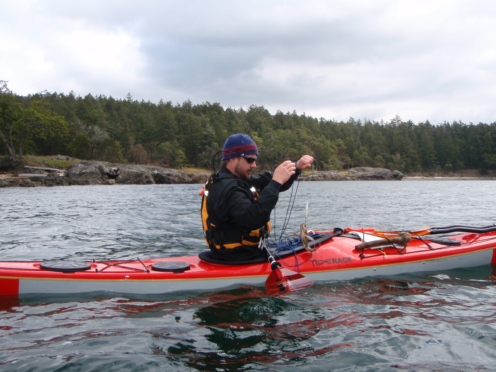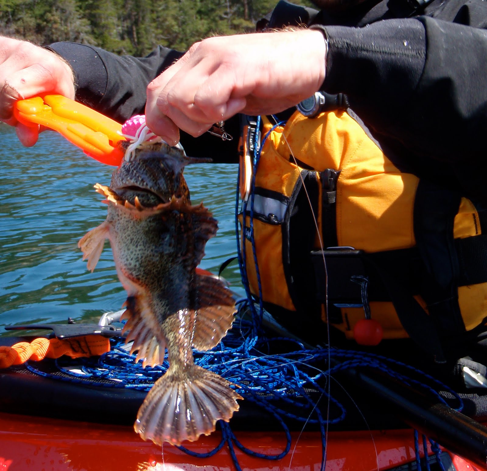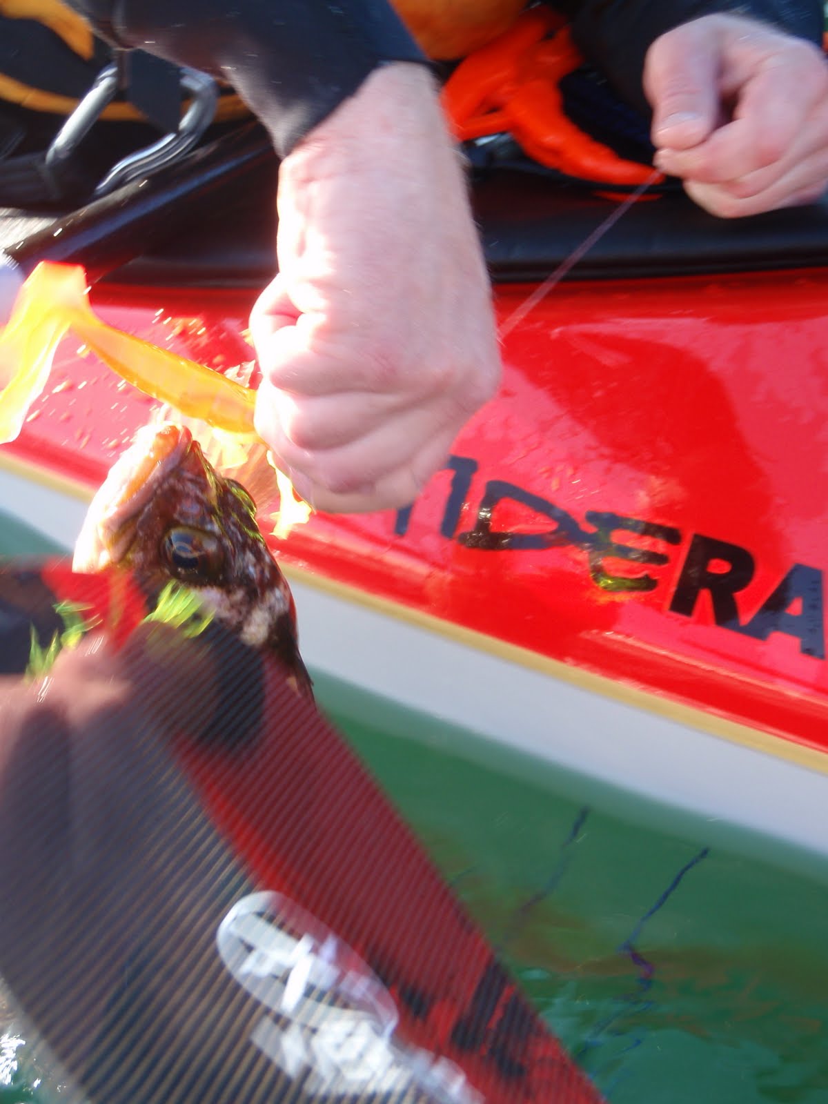 The following day, Shawn was feeling ill and spent most of the day resting and trying to get well. Shay and I decided to fish around Jones Isl. and take it easy. I managed to land two undersized lingcod, two rockfish, and a cabezon while jigging the handline from my sea kayak before lunch.