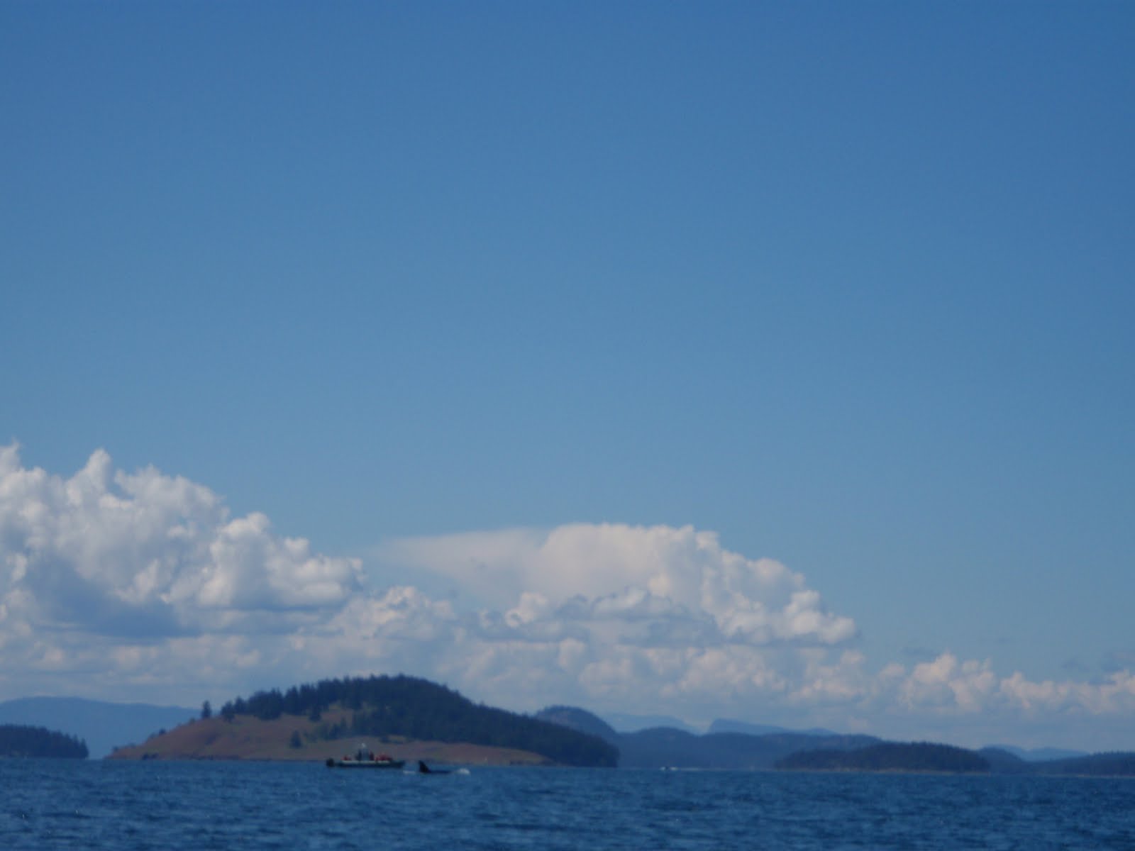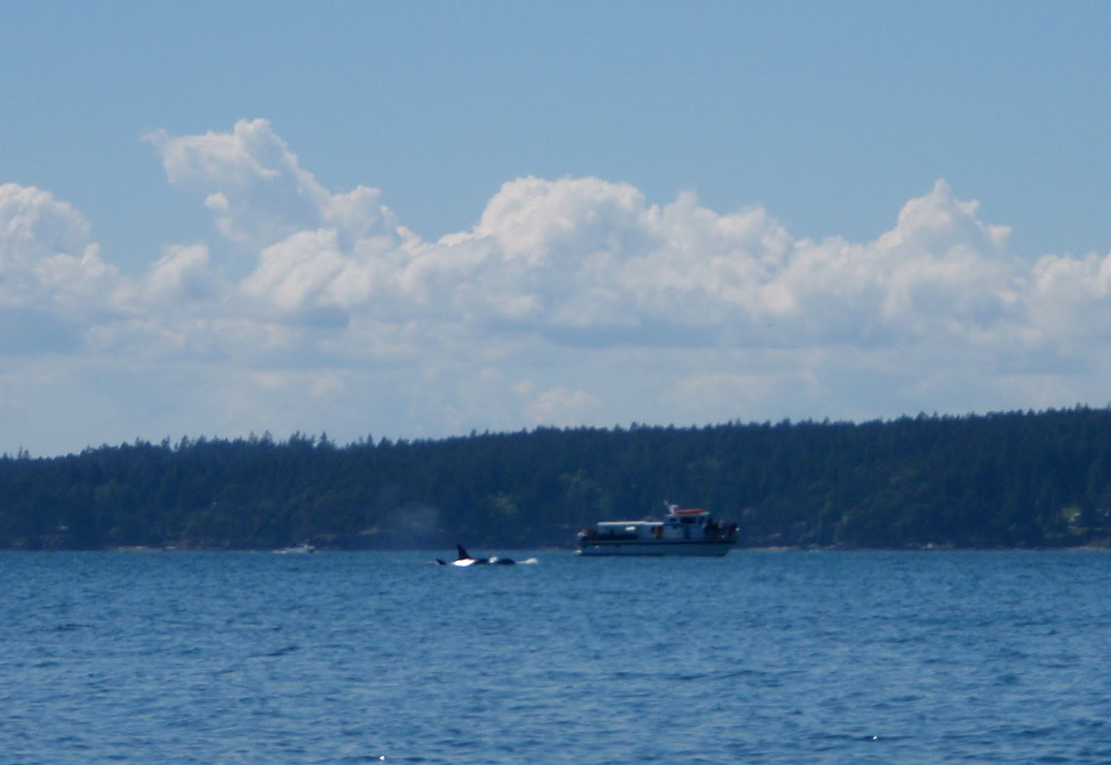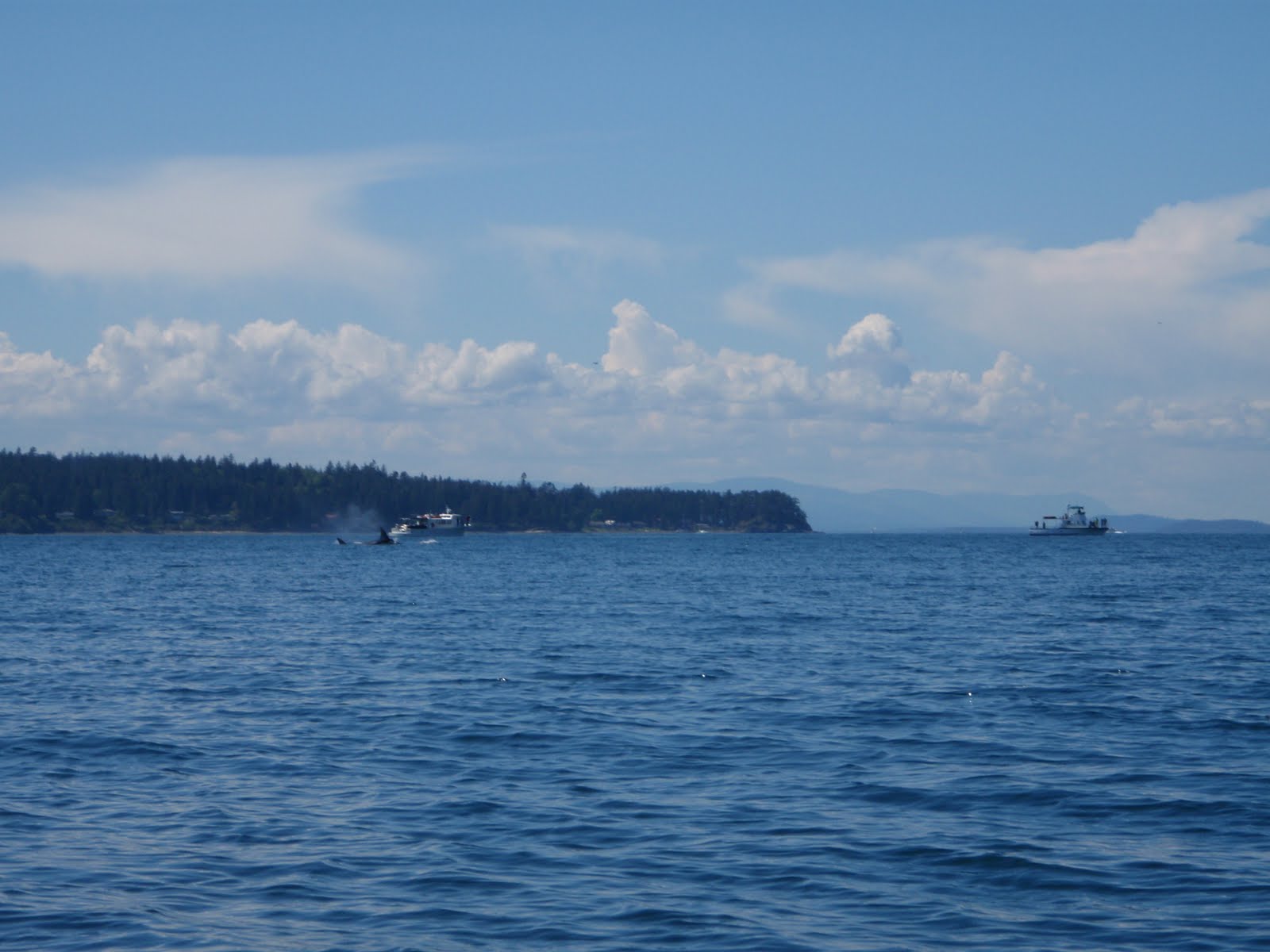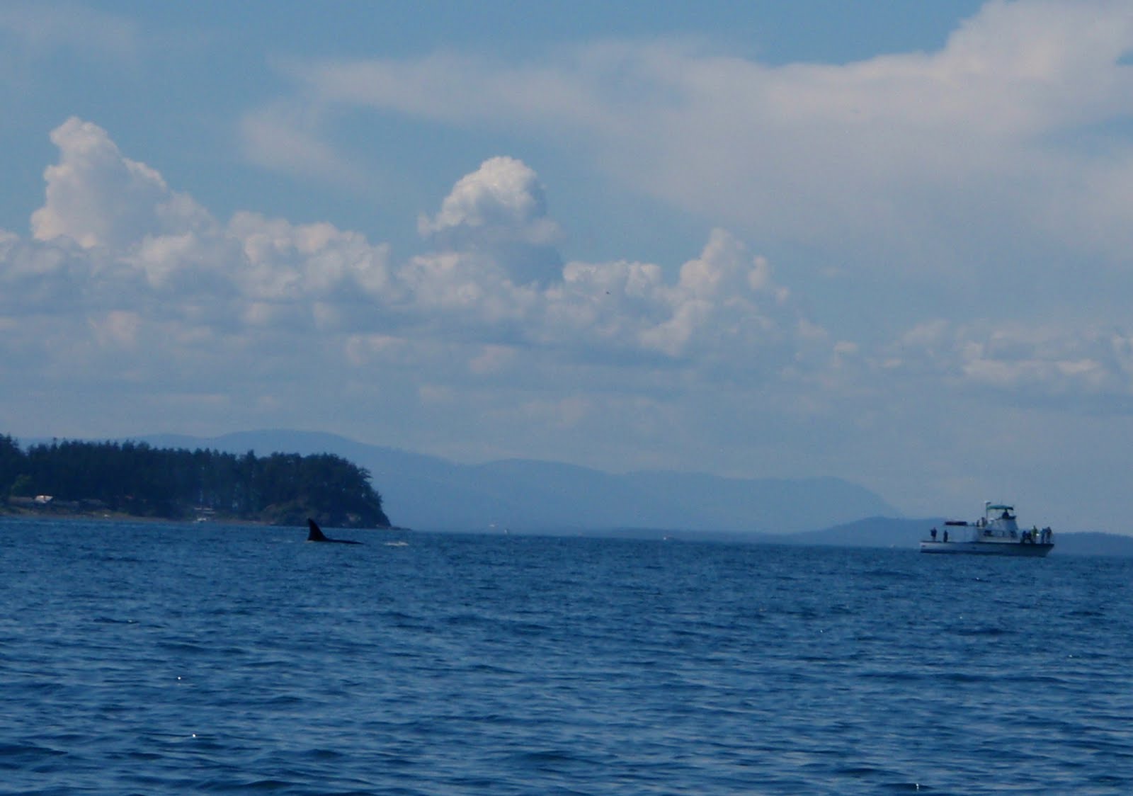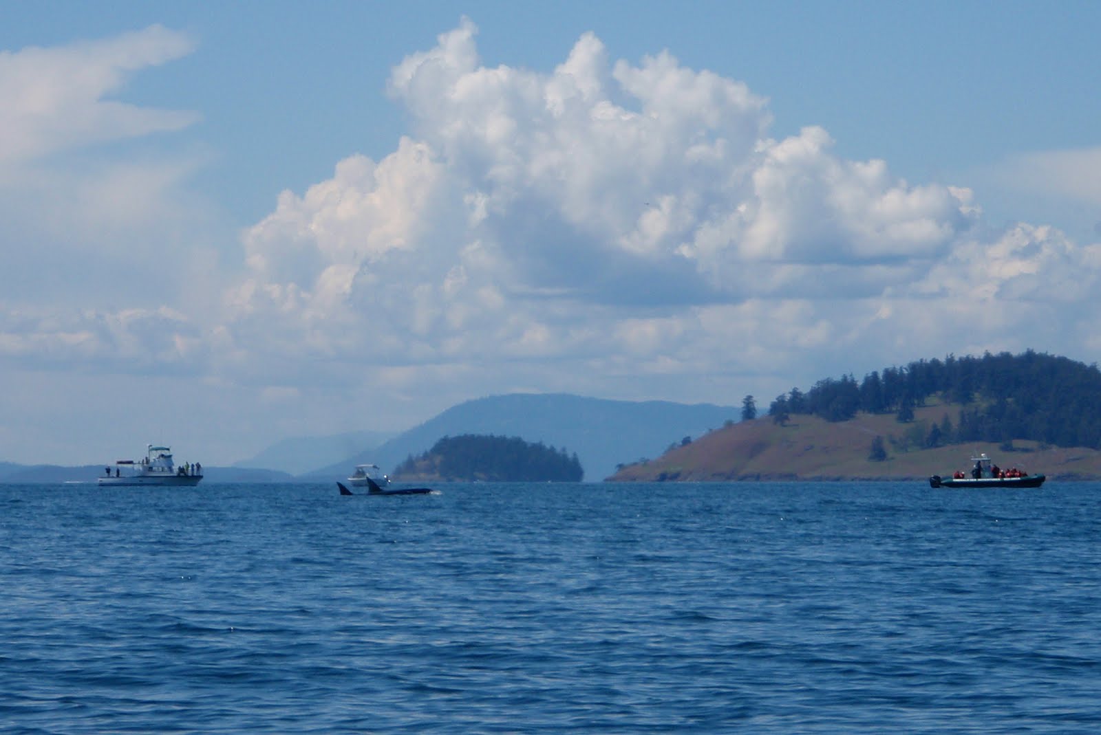 After our hike, Shay and I hit our boats and fished a bit more while Shawn got ready for touring. For some reason the fish just weren't biting like they were the day before. I changed jig colors a dozen times with no luck. I couldn't figure out why the bite had completely turned off, when I looked to my left and saw a dozen people staring at me from a boat on the water. I quickly glanced around and saw 4 boats with people on deck all staring at me. All of the sudden it dawned on me that they were whale watching boats. I turned to Shay and said " I bet there's an orca around.", not really believing my own words. I looked up the shore line and saw Shawn launching off the beach in his kayak. Shay and I started paddling towards Shawn, when all of the sudden, I see a huge black dorsal fin breach the surface 200 yards behind Shawn. "ORCA!!!" I shouted as I pointed out the dorsal. I've spent over 40 days touring the San Juans by sea kayak, and this was the first time I had ever seen orca whales. Needless to say, the three of us were giddy with excitement as we observed the whales pass through the channel right in front of our camp, sometimes coming within 300 feet of our boats. As the whales left our area, the tourist boats raced around the point to follow them as they headed North of Jones Isl. Although the experience was completely thrilling and amazing, I felt sorry for the whales. I thought about how stressful it must be having a half dozen power boats chasing you your entire life. I decided I would never follow the whales if I ever saw them again. I would simply sit and watch as they pass through and be thankful for the experience.